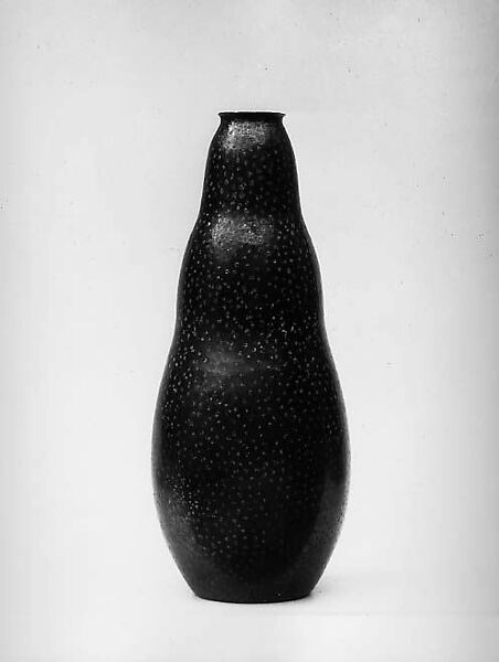 This gourd-shaped vase is a masterful example of traditional metalworking. Dunand excelled at the craft of dinanderie—a term derived from Dinant, a town near Liège, Belgium, where hand-worked metalwares had been produced since the Middle Ages. The process consists of raising a form from a thin, flat sheet of metal (usually copper) by hammering over shaped molds in a spiral pattern starting at the center of the sheet. Occasional reheating of the object is necessary to prevent the metal from becoming too brittle and fracturing during the process.