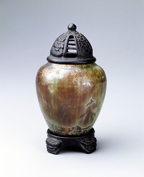 Robineau used tiny molded test pots, like this example, to experiment with new glazes. She was so pleased with this vase that she carved for it a petite porcelain stand and cover, glazed to resemble carved wood or cast metal. Occasionally she offered the test pots for sale, with or without stands and covers.