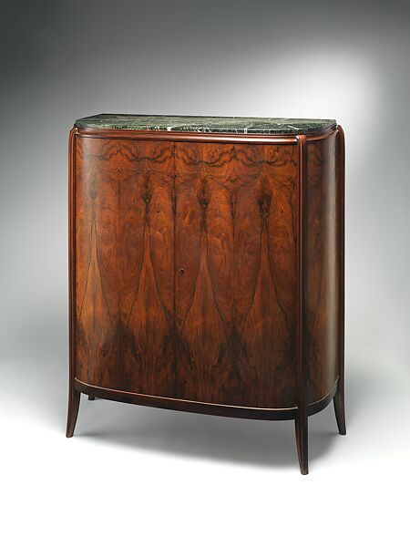This cabinet formed part of the furnishings of the main salon of the É-J. Ruhlmann pavilion at the 1925 Exposition International des Arts Décoratifs et Industriels Modernes, Paris. While Ruhlmann designed and made the vast majority of the furnishings in his pavilion, a few works were supplied by his friends—essentially, to fill in gaps. Its simplicity of form is offset by the spectacular graining of the wood veneer, with perfectly matched repeats that resemble watered silk.
