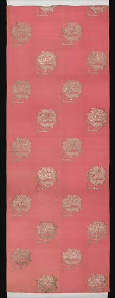 vase-of-flowers repeat pattern. At the same time, the stylization of the floral motif and the outré pink-and-silver colorway make it unmistakably