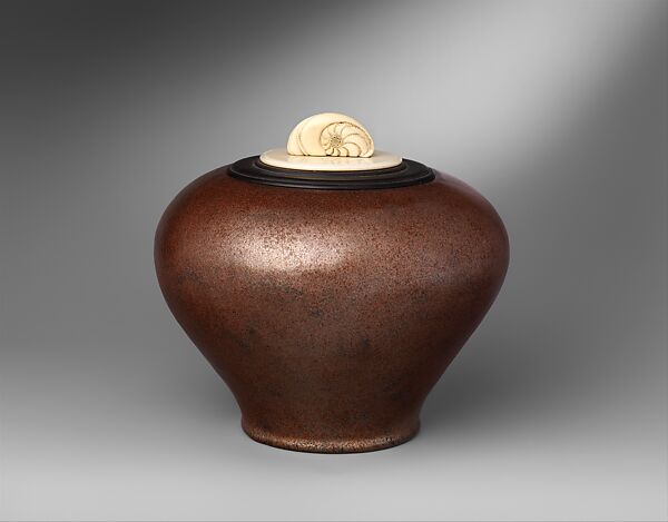 This Japanese-influenced jar was a collaborative effort between the potter Simmen and his wife, Eugénie Jubin, known as O’Kin. Simmen created the shimmering aventurine-glazed vessel; O’Kin carved and gilded the delicate wood and ivory lid.