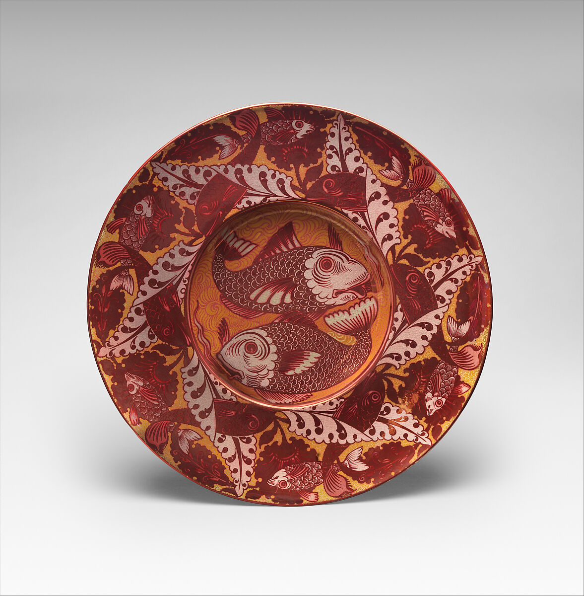 De Morgan, who began his career painting stained glass for William Morris’s company, noticed iridescent effects in silver paint and then experimented to achieve lustered glazes on earthenware inspired by fifteenth-century Hispano-Moresque wares. This charger combines red and yellow lusters to describe fish swimming through a leafy pond. It was once owned by Morris, who displayed similar ceramics on his mantelpiece at Kelmscott House, Hammersmith, London.