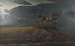 In fall 1931 Burchfield began this painting after feeling the need to "re-embrace [the] epic poetry of American life" as represented by "the vast lonely stretches of the Midwest. The composition is based closely on one of Burchfield's first oil paintings, a smaller canvas entitled Late Afternoon Twilight (Burchfield Penney Art Center, SUNY Buffalo State, Buffalo, New York), however, the landscape and sky are embellished and dramatized. As the artist wrote: "I have tried to express the coming of winter over the middle-west as it must have felt to the pioneers—great black clouds sweep out of the west at twilight as if to overwhelm not only the pitiful attempt at a town, but also the earth itself." The Met purchased November Evening in 1934, the year it was completed.