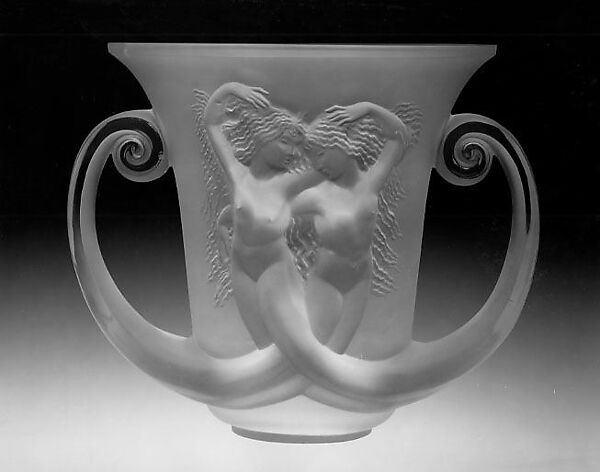 This vase is decorated with intertwined pairs of naiads—nymphs from Greek mythology who resided in, and were associated with, fresh water: streams, springs, wells, and fountains. The combination of classical iconography and bold form typifies much French Art Deco of the 1930s.