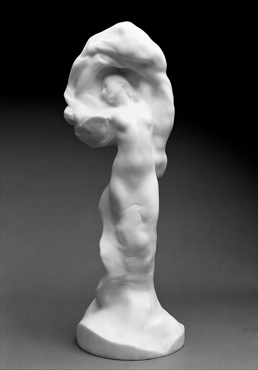 Dawn (Eos in Greek mythology, Aurora in Roman) traditionally signifies hope, youth, and unending possibilities. This sculpture of a male figure lifting a veil of clouds to reveal a female emerging from the stone symbolizes a new day casting off the darkness of night. Beach portrayed Dawn as young and beautiful, conforming to the standard artistic interpretation of the subject. Unveiling of Dawn recalls the work of sculptors Medardo Rosso and Auguste Rodin in its rough texture, unfinished quality, and symbolism.