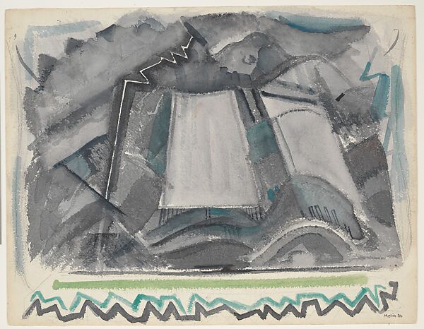 An accomplished watercolorist of the Maine coast and eastern cities, Marin journeyed west to Taos, New Mexico, in 1929 and again in 1930. In his two summers there, he executed almost one hundred watercolors of the area’s expansive landscape and quick-changing weather as well as the customs of local Indigenous people. Storm, Taos Mountain, New Mexico is a mix of the natural and the abstract: mountain ridges, dark clouds, and lashing rain transform into a play of geometric shapes, zigzags, and billowing lines. At the bottom edge, Marin adds a lightning-like design clearly inspired by Southwest Indigenous art, a powerful influence for many American artists experimenting with abstraction.