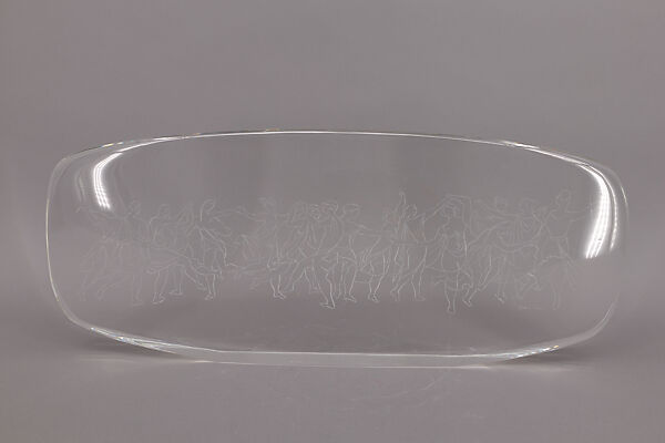 According to the 1954 catalogue for the "British Artists in Crystal" exhibition (held at the Steuben Showroom), Piper—a noted painter and watercolorist—"takes a holiday from the neo-romanticism of which he is one of the leaders in British painting today. He has deserted the Gothic for the Grecian mood, and his circling dancers print a gay rhythm upon transparency."