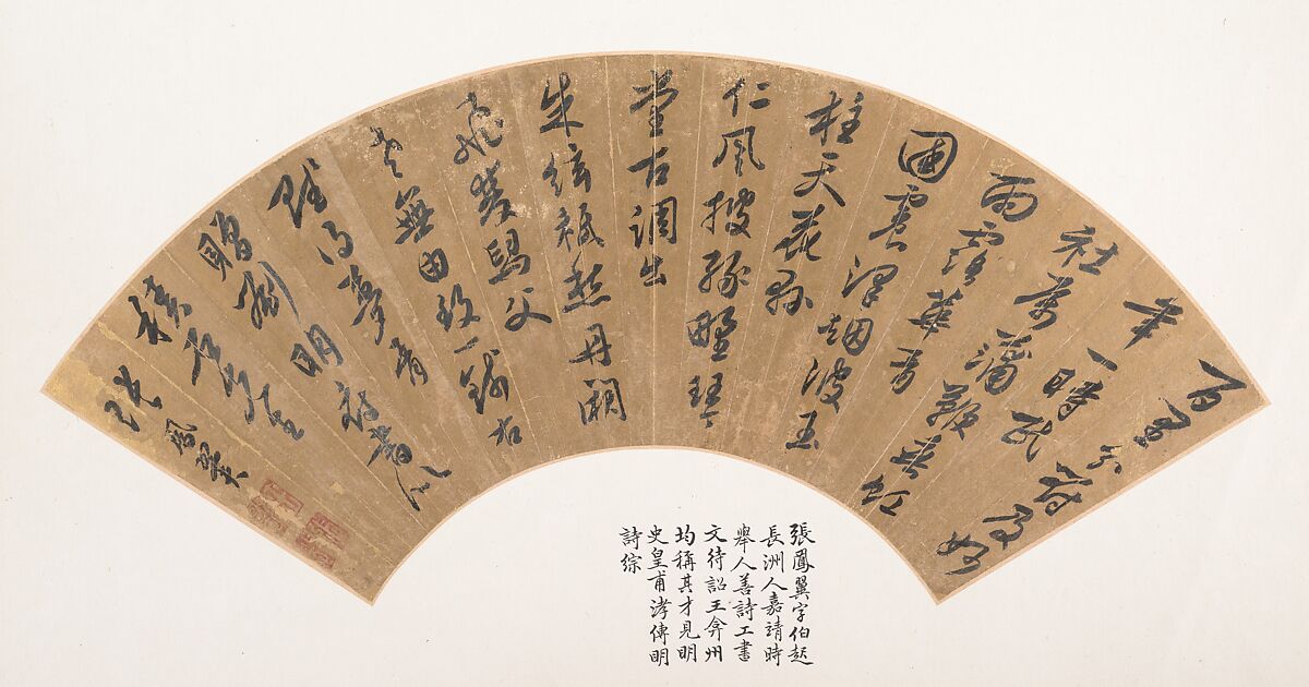 - Medium: Folding fan mounted as an album leaf; ink on gold paper