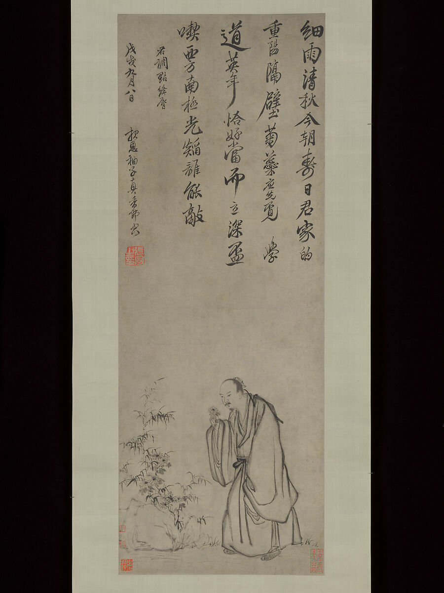 This painting is a copy of a work by the writer-artist Zhang Feng. The original, a birthday gift for a friend, was executed on the eve of the Double Ninth Festival—the ninth day of the ninth lunar month—when tradition called for ascending the heights and drinking chrysanthemum wine. Zhang's subject matter was undoubtedly inspired by the occasion, but it also pays tribute to the poet Tao Qian (365–427), who was renowned both for his rejection of an official position and for his love of chrysanthemums and wine. He depicts the chrysanthemum's most famous admirer enjoying the bouquet of a plant that has grown in the company of rocks and bamboo—symbols of a life in reclusion, which, on a different level, can be construed as congratulatory wishes for long life.