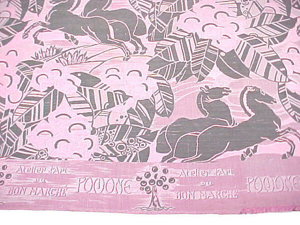 In 1913 the famous Paris department store Au Printemps founded Primavera, its interior design and decorating department; during the 1920s the city’s other major department stores followed suit, including Bon Marché (Pomone, est. 1922), Galeries Lafayette (La Maîtrise, est. 1922), and Grands Magasins du Louvre (Studium Louvre, est. 1923). Each store sponsored its own pavilion at the 1925 exposition to display the range of its wares. Little is known about Renée Schils, the designer of this textile, who was presumably a contractual worker for Pomone.