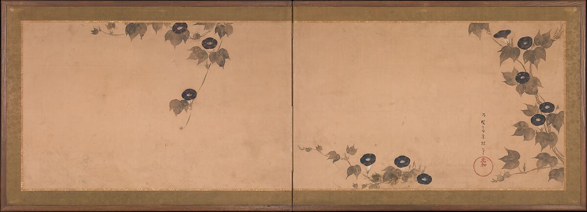 This understated painting of morning glories in various stages of bloom shows a fluent use of Rinpa idioms, such as the mottled-ink (tarashikomi) technique seen in the leaves. Also characteristic of the Rinpa aesthetic is the elegantly spacious arrangement of the morning-glory vine within the horizontal composition. Signed “Hyakurinsai Sōri” and accompanied by a seal reading “Genchi,” of the circular type used by Sōtatsu and Kōrin, this is a Rinpa-style work by an Edo painter who has in the past been mistakenly identified with Hokusai.