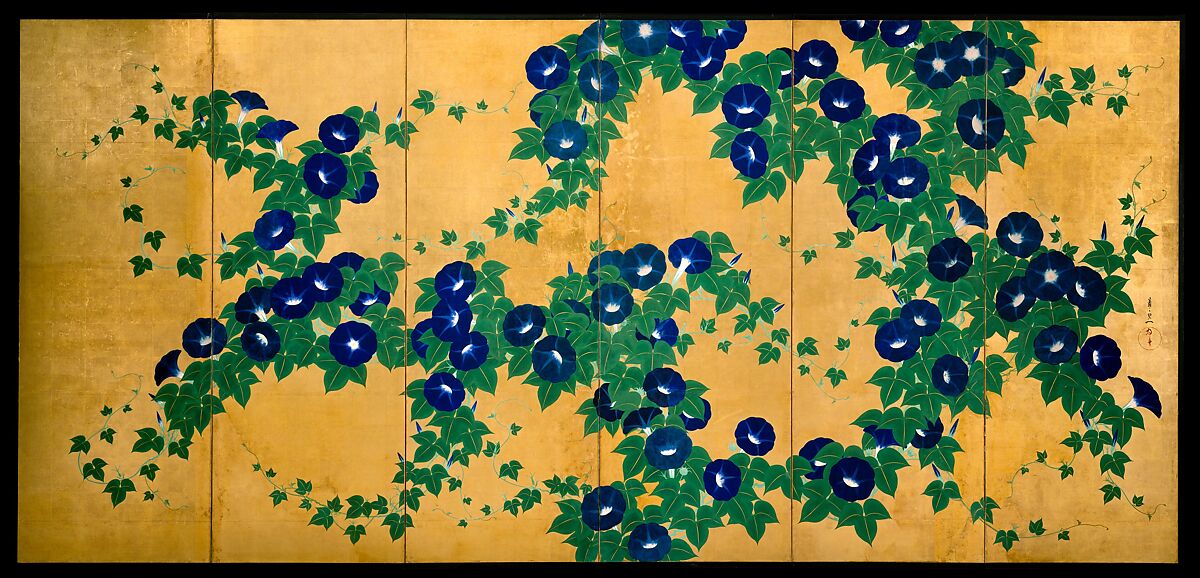In this vivid display of rich blue and green against a gold-leaf background, Kiitsu concentrated on the proliferation of the blossoms and leaves by omitting any indication of space or context. The exuberant outburst is carefully orchestrated into two movements: the blossoms on the right rise up from the ground, while those on the left cascade down as if supported by an unseen trellis.