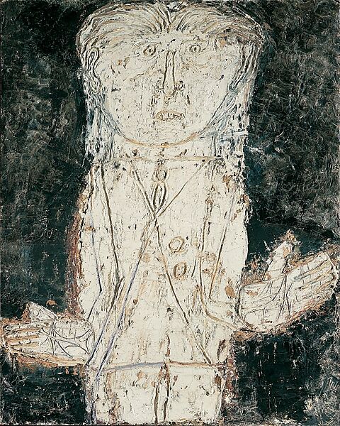 Dubuffet waited until he was forty to devote himself to art. A man of exceptional intelligence, he painted raw, although childlike, images that combine a bold handling of texture with a wry, dark sense of humor. The subjects of his early paintings are city streets, ordinary people performing everyday tasks, and likenesses of his friends. In 1945 Dubuffet had begun creating what he referred to as hautes pâtes, paintings in which a thick paste served as the ground, color was used sparingly, and contours were scratched like graffiti. The paste used for the ground was made of tar, asphalt, and white lead, often enriched with cement, plaster, or varnishes, to which sand, coal dust, pebbles, and pieces of glass or straw might also be added. Gradually, color virtually disappeared from his work altogether. In this portrait of Jean Paulhan, the ground and the paint surface are built up with heavy chalk, thus continuing Dubuffet's use of the hautes pâtes technique. Consistent with his "anti-art" position, Dubuffet rejected traditional portraiture, which he regarded as facile imitation. Instead of conveying a sitter's likeness or personality, he focused on certain odd features, which he then exaggerated. Paulhan's intense, close-set eyes, long nose, broad upper lip, two prominent upper front teeth, and thick mane of unruly hair are easily recognizable. His strangely monolithic form seems to emerge from plaster or chalk that has been smeared onto a dark wall; the lines of his face, outstretched hands, jacket, tie, and buttons have been scratched, like graffiti.