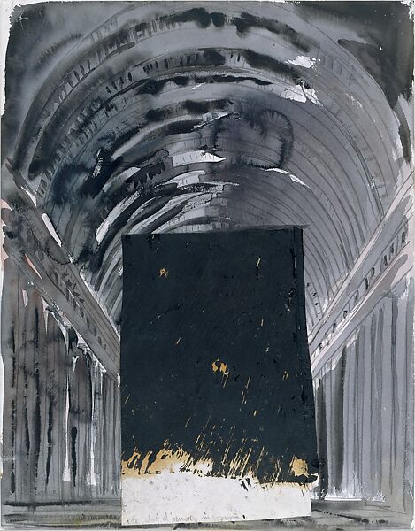 Kiefer inscribed the title of this work in French at the bottom center—Le chef d'oeuvre inconnu—a title shared by Honoré de Balzac's story from 1831 in which an aging Baroque painter named Frenhofer works for many years to perfect a portrait that consumes him completely. Frenhofer labors in secret, painting layer upon layer, year after year, but when his followers finally view the picture, they discover that it is nothing but an unrecognizable and endlessly layered abstraction. They deem it the work of a genius gone mad. As if to link the madness of Frenhofer—whose story has also been read as an allegory of modern art—with the architectural fantasies of Nazi Germany, Kiefer bases the watercolor backdrop on a rendering of the projected Soldier's Hall for Berlin that was first sketched by Adolf Hitler in 1936. Albert Speer commissioned the architect Wilhelm Kreis to design its barrel-vaulted interior on a huge and unprecedented scale. It was never built. Meant as a monument and ceremonial hall to celebrate the victories of the German army, now its endless, imaginary columns are imbued with the horrors of the Holocaust.