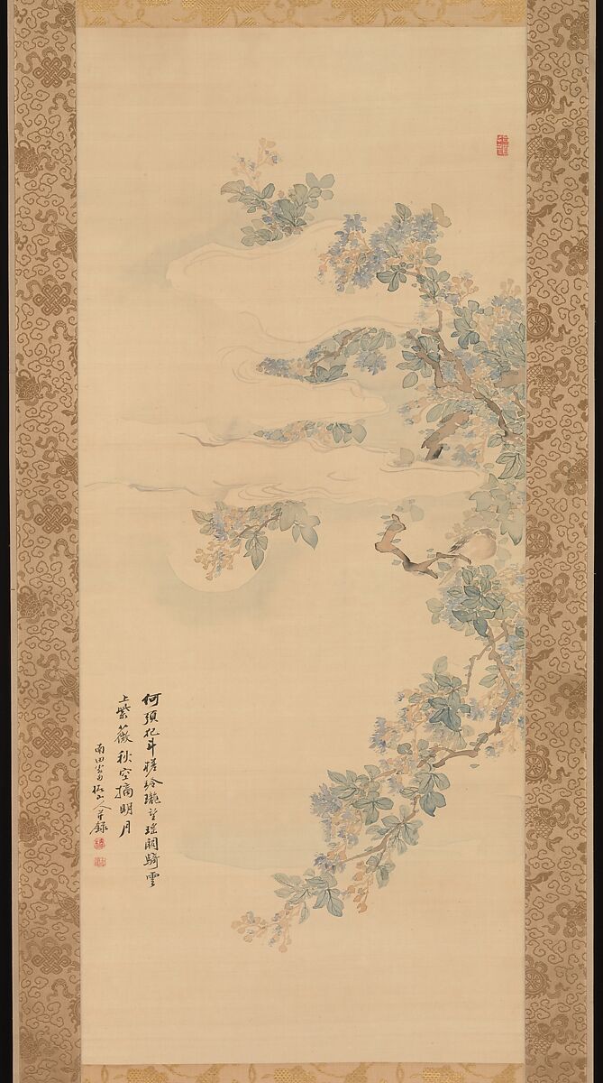 At a time when the ukiyo-e tradition was emphasizing scenes of contemporary life in the urban world, nanga or "southern pictures," inspired by Chinese painting of the Ming and Qing dynasties, offered a retreat into the unhurried world of nature and art. Tsubaki Chinzan shows us a formal yet abbreviated landscape, where just two softly rendered boughs of the myrtle tree open their delicate foliage to embrace the rising moon, partially obscured by clouds. The evening mood invites contemplation and quietude, in an intimate moment shared with a tiny bird who is nestled securely among the spring foliage.