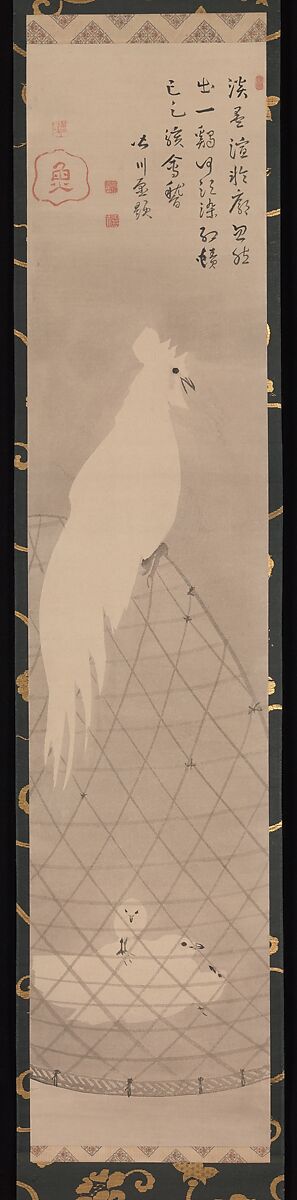 The rooster, representative of the patriarchal head of the family—per the Confucian ideal—was a popular subject in Chinese and Japanese painting of the premodern era. Here, the birds are silhouetted in negative white against a background of gray ink wash. Together with Itō Jakuchū (1716–1800) and Soga Shōhaku (1730–1781), Rosetsu was known as one of the “Three Eccentrics” (san kijin) of eighteenth-century Kyoto. He studied with Maruyama Ōkyo (1733–1795), founder of Kyoto’s Maruyama school.