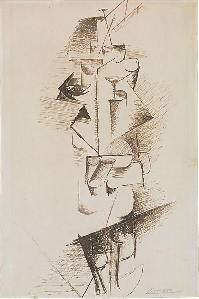 Daniel-Henry Kahnweiler, who was a pioneering historian of Cubism as well as its preeminent dealer, wrote that in the summer of 1910, Picasso "pierced the closed form." In doing so, he made "the decisive advance which set [C]ubism free from the language previously used by painting." As seen in this ink drawing, space flows freely through the mass of the figure, producing a scaffolding of planes. Without the title, there is little to suggest the subject matter, let alone the gender of the figure, which was likely rendered without a model. Only the vertical orientation and varying combinations of curved and diagonal lines prompt us to visualize the head, breasts, shoulder blades, and limbs.