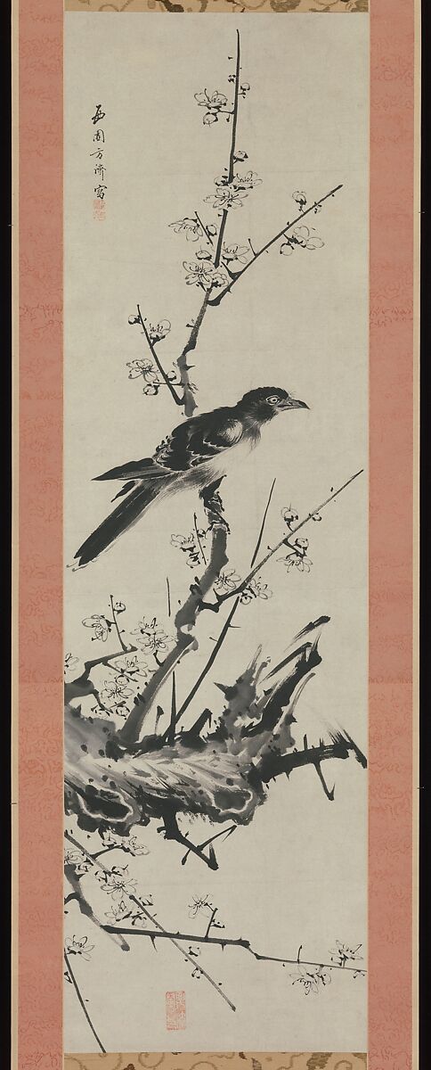 A single mynah bird rests upon a flowering plum tree in this rapidly executed ink painting. In his subject matter, the artist has followed models set forth in Ming-dynasty Chinese painting. His brushwork is characterized by a spirited roughness and the liberal use of thick ink to create dynamic contrasts, which brings a remarkable sense of volume to both branch and bird. Xiyua Fangqi, known in Japan as Saien Hōsai, was a Qing-dynasty Chinese merchant and painter. He was thought to have been from either Jiangsu or Anhui Province, and to have traveled to Japan on a number of occasions beginning about the year 1772. One story says that he once drifted ashore in what is today Chiba Prefecture, in eastern Japan, and along the way to Nagasaki he saw and painted Mount Fuji. He is said to have brought the painting back to China, where it generated much interest.