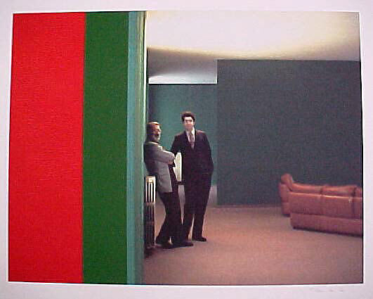 In autumn 1990, after his sixth show with the Milanese gallerist Giorgio Marconi, Hamilton joined Marconi and his son Giò on a trip to Alba and Asti for white truffle season. Having snapped a photo of the two courtly art dealers in the lobby of their hotel, Hamilton enlarged the small-format image to a large scale in preparation for a painting, which amplified the photo’s grainy texture and flattened out the architectural space. Hamilton further exaggerated this abstraction of the walls and ceiling through digital manipulation, creating flat planes of Pointillist-like green, red, and white—the colors of Italy’s flag.