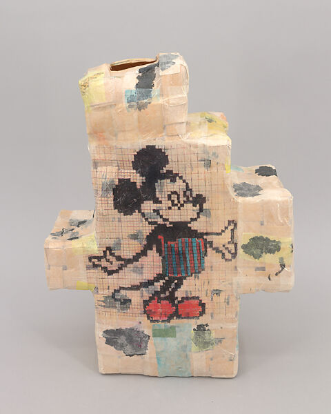 Ed Rossbach used mixed media to create works that challenged the notion of basket making. Many deal with contemporary issues, often inflected with a sense of humor. For Happy Days he wove poplar to create the unusual stepped basket form to which he applied various papers with pixilated images of Mickey Mouse on either side.