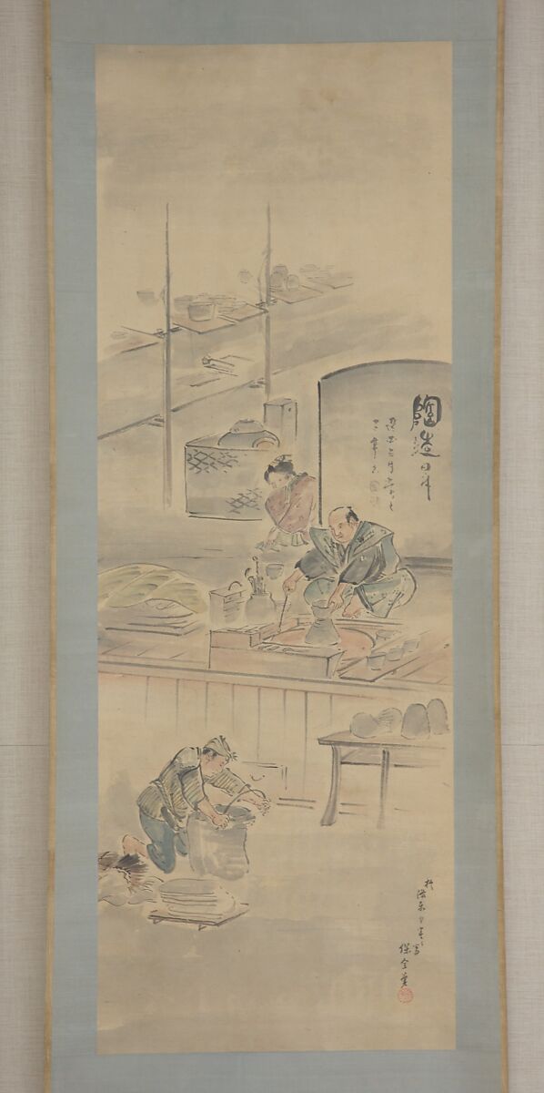 Hozen, the eleventh-generation master of the Nishimura family, learned pottery techniques in Kyoto and produced tea utensils prized by the Sen family of tea masters. After 1827, he sealed his works as “Eiraku.” He produced a variety of fine-quality wares, most of them special orders, including blue-and-white porcelain, copies of Chinese porcelain, and Cochin-style (Kōchi ware) works with polychrome glazes. One of his signature techniques was the delicate application of overglaze gold patterns (kinrande) on red ground. Furthermore, Hozen made numerous copies of Ninsei ware. He was one of the most influential ceramists in Kyoto in the nineteenth century. An amateur painter, he created this series of six hanging scrolls (18.77.2–.7) depicting the process of ceramic production.