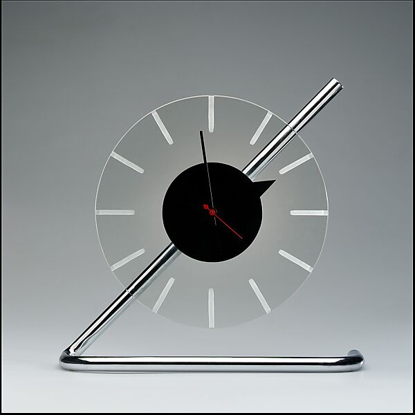 Rohde was known primarily as a furniture maker whose progressive designs were produced by well-known manufacturers such as Heywood Wakefield, Troy Sunshade, John Widdicomb, Herman Miller, and Thonet. In 1932 and 1933 he created a series of clocks for the Herman Miller Clock Company that were remarkable for their daringly advanced designs. The transparent glass face of this example is suspended in front of a chromed diagonal support, its sharp angle abstractly reinforcing a sense of dynamic motion. The "numerals"—slashes of white—seem to float on the clear glass surface, highlighting the sharp, dominant black hour hand. The color scheme of black, red, and silver and the use of sleek materials such as chrome and glass typify the kind of furnishings that complemented luxury interiors of the 1930s. Although most people were struggling to make ends meet during the decade-long Great Depression, the elegant penthouse atop a skyscraper apartment building represented a privileged fantasy world that dominated Hollywood movie sets as well as designs for luxury city dwellings created by the most contemporary architects and designers.