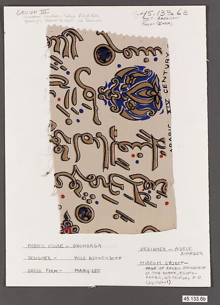 - Credit Line: Gift of Onondaga Silk Company Inc., 1945