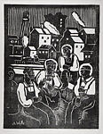 A leading graphic artist and teacher, Wells popularized the medium of printmaking with linoleum. This linocut depicts mill workers on their lunch break with an industrial backdrop. Composed of stark forms rendered in black and white, the print showcases Wells’s direct, even blunt manner of cutting into linoleum and reveals his admiration of the printmakers associated with German Expressionism, such as Ernst Ludwig Kirchner. Workers ranked highly among the numerous and diverse subjects that Wells depicted over his long career. Due to the painful legacy of slavery, images of salaried labor resonated deeply in African American communities.