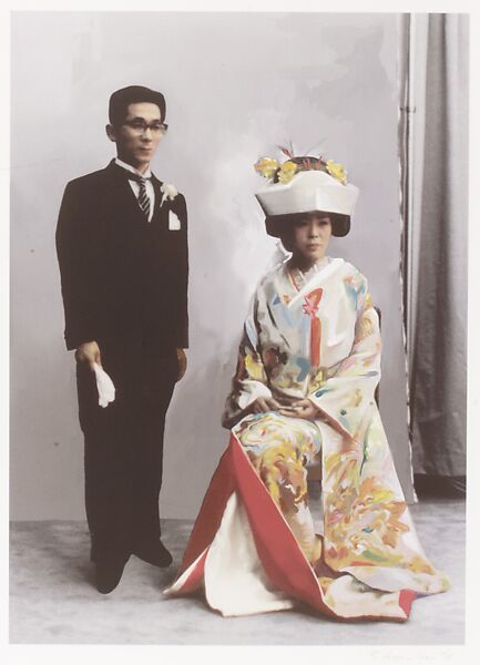This exceptionally lush print has a humble source: the discarded photograph of a young Japanese couple on their wedding day that Hamilton found nearly thirty years earlier in Hamburg. The subject recalls Jan van Eyck’s famous Arnolfini Portrait (1434; National Gallery, London), about which Hamilton wrote: “[It] does embody all that I most admire in art: incredible technical mastery (in a medium that van Eyck was himself inventing) set to the service of an arcane symbolism that moves its audience with profound simplicity. It is an epiphany, a crystallization of thought that gives us an instant awareness of life’s meaning.”