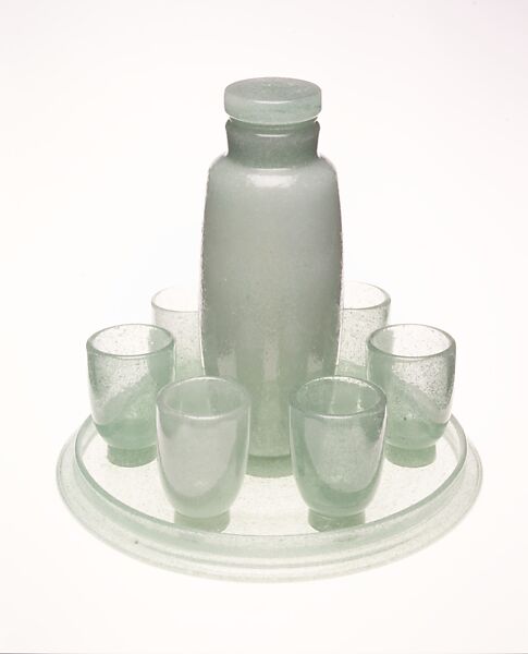 - Dimensions: Carafe with Stopper: H. 9 3/4, Diam. 3 7/8 inches (24.8 x 9.8 cm); Tray: H. 7/8, Diam. 11 1/4 inches (2.2 x 28.6 cm); Glasses: H. 3, Diam. 2 3/8 inches (7.6 x 6 cm)