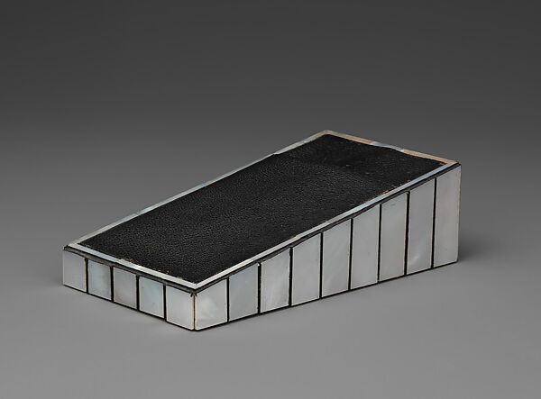 Hoffman’s simple grid showcases the marquetry of precious wood and mother-of-pearl. This notepad holder belongs to a desk set (MMA 1977.72.1ab–5) that is an early example of a modernist aesthetic based on geometry rather than natural elements, a formal conceit that spanned various scales, from buildings to ink pads. The basic volumes and shapes of the set suggest mini-architecture, or an urban landscape.