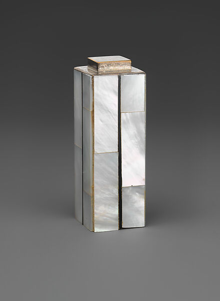 Hoffman’s simple grid showcases the marquetry of precious wood and mother-of-pearl. This seal belongs to a desk set (MMA 1977.72.1ab–5) that is an early example of a modernist aesthetic based on geometry rather than natural elements, a formal conceit that spanned various scales, from buildings to ink pads. The basic volumes and shapes of the set suggest mini-architecture, or an urban landscape.