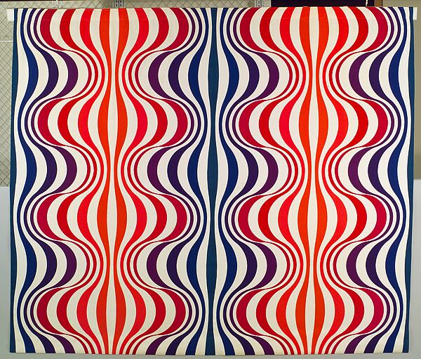 Though Panton is best known for his plastic stacking chair (MMA 1986.425)—the first single-form, single-material chair to be mass produced—he was also responsible for designing a remarkable series of textiles for the Swiss manufacturer Mira-X. With its psychedelic, undulating wave pattern, this textile is a characteristic example of Op Art design, which experimented with abstract optical illusions achieved through judicious use of variation in hue and pattern. The palette is typical for Panton, and utilizes sequential variations in the limited color range that he favored for interior design.