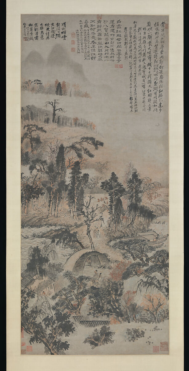 Exploring the theme of intoxication, Shitao makes us reel with the unsteadiness of his figures and landscape. He probably created this picture to commemorate an autumn outing in the hills with friends. The three inscriptions testify to the pleasure and pride that Shitao took in his achievement; they make it clear that the exhilaration experienced by the friends was inspired by nature, poetry, conviviality, and creativity as well as wine.