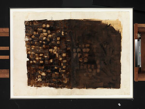 - Medium: Asphaltum, oil paint, and black porous point pen on joined papers