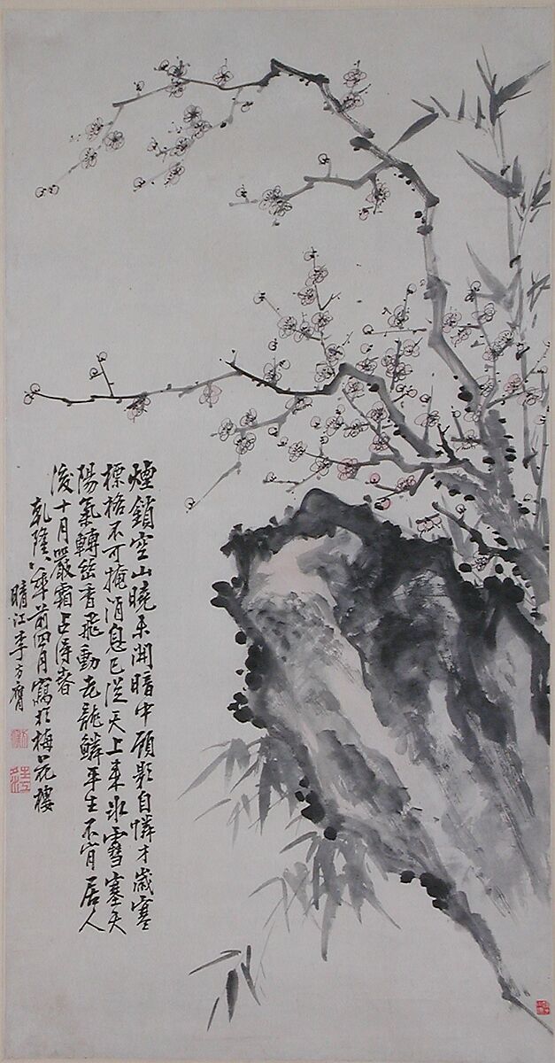 Only after failing in his pursuit of a career as a government official did Li Fangying dedicate himself to painting as a means of survival. For Li and men like him, the plum, which dares to bloom in the cold of late winter, was a symbol of perseverance in a world that did not appreciate their talents. Li’s love of blossoming plum was such that he named his studio the Plum Blossom Tower; it was there, in 1743, that he made this painting. The poem reads, in part: