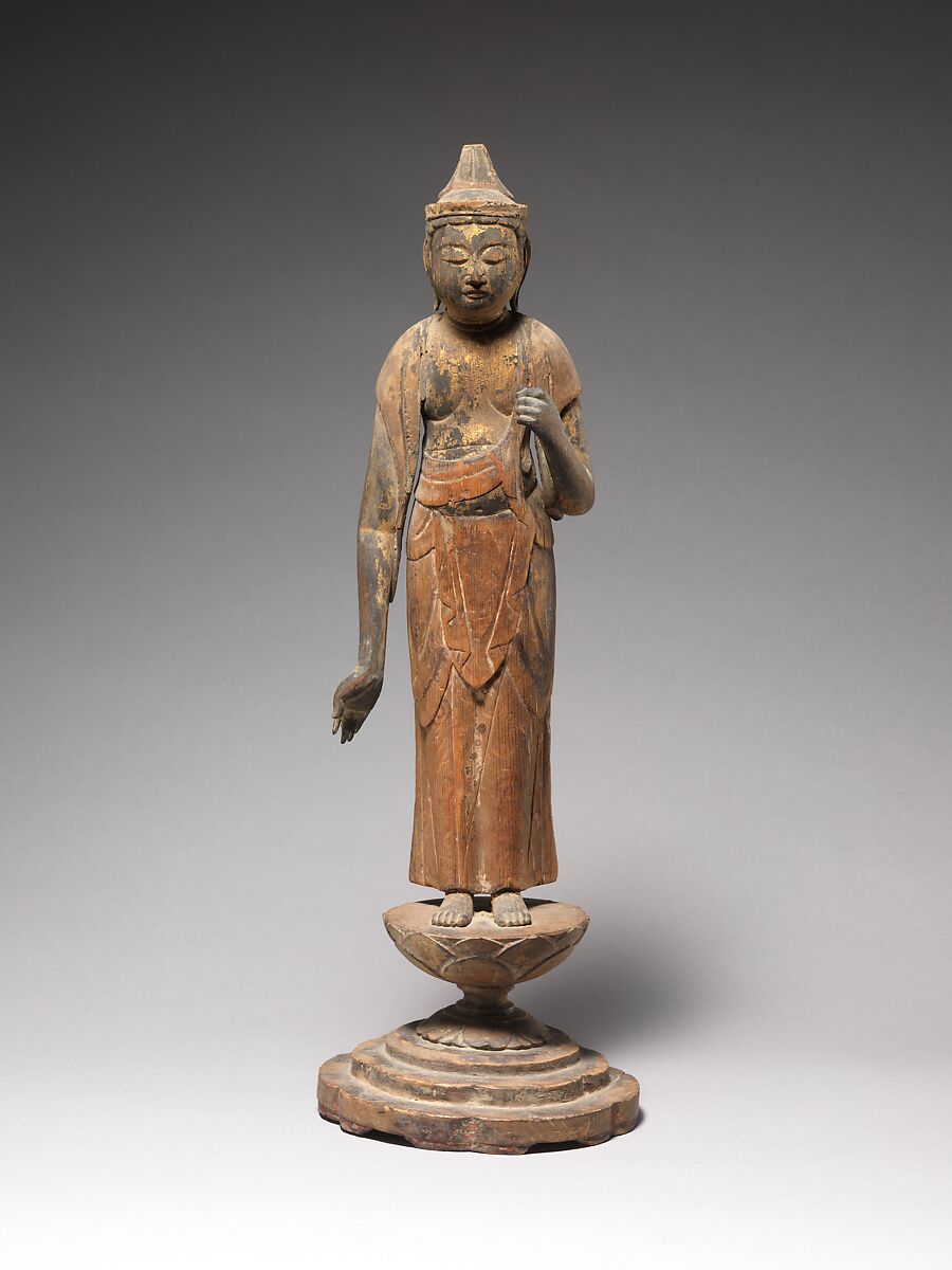 In the 1100s, the powerful Fujiwara family commissioned one thousand sculptures of Shō Kannon, the primary incarnation of the compassionate Buddhist deity Kannon and a rescuer of suffering souls. Traces of color and gold on this example, which once held a lotus bud in its left hand, hint at the resplendence of the original sculptural tableau. The Fujiwara commissioned the sculptures for Kōfukuji, a Buddhist temple in the ancient capital of Nara that they had patronized for more than five hundred years. The sculptures were dispersed in the nineteenth century and are now held in collections worldwide.