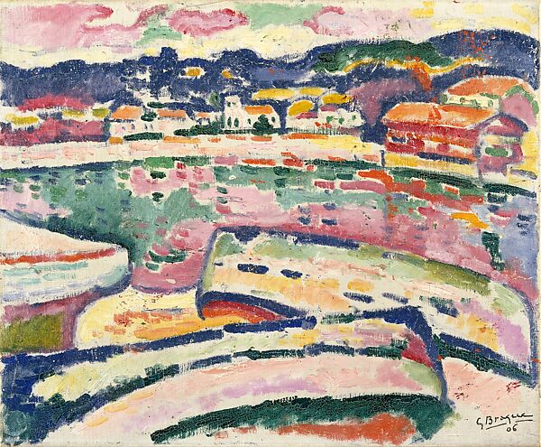 Following in the footsteps of Cézanne and Derain, Braque spent part of the fall of 1906 and the following winter in the Mediterranean fishing village of L’Estaque. This vibrantly colored harbor view reflects his discovery, at the Salon d’Automne of 1905, of the Fauve painters.