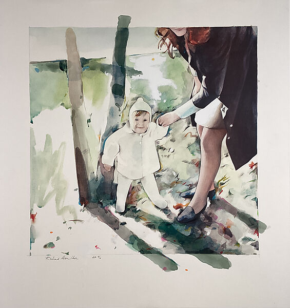In 1969, while working in Milan, Hamilton was given a snapshot of a colleague’s wife and child. He kept the photograph in his studio for fifteen years before making works based on the image. This print was preceded by a watercolor of the subject and followed by a full-scale painting. Drawn as much to the bright, sun dappled setting as to the casually cropped image of the mother, Hamilton undertook a highly complicated technique for translating the watercolor version to this print. Collotype is a seldom-used photomechanical process developed in the nineteenth century. When allied with screen print, said Hamilton, it “works wonders.”
