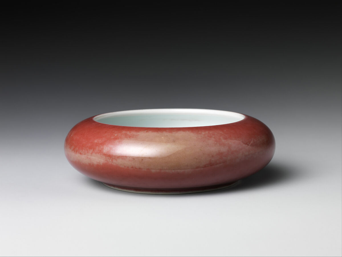Derived from copper, lush pinkish-red glazes were first produced in the third quarter of the seventeenth century as part of experimentation at the Jingdezhen kilns. The delicate red and greenish spots that mottle the surface of this vessel are part of the appeal of this elegant and hard-to-make “peach bloom” glaze.