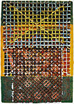 One of a series of intricate prints titled with various hyphenated compound nouns, Gas-Up celebrates its multipart makeup. A layered lattice of grids, typical of Shields’s work and drawn from the geometry of 1960s Minimalism, amasses a thicket of pattern and texture. Shields was often associated with the 1970s Pattern and Decoration movement, which sought to democratize American art by aligning itself with various craft and decorative traditions. Visible machine stitching and dangling threads (skeletal cores of the paper pulp grids) echo Shields’s frequent use of a sewing machine to construct his work, while the stenciled and boldly colored patterning evokes an international vocabulary of textiles, such as the wax prints popular in West Africa.