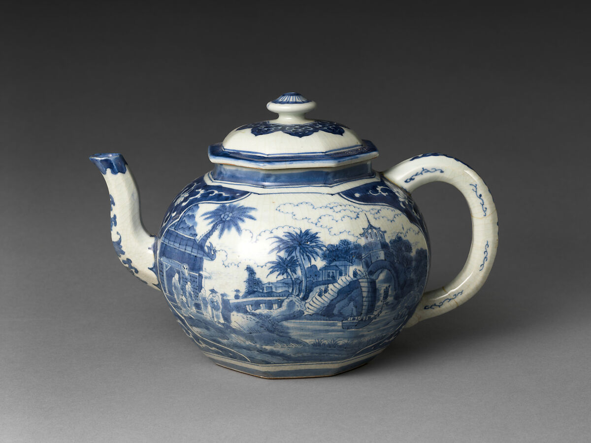 This teapot was painted in Europe after it had been imported there. The design is attributed to the Dutch artist Olfert Dapper (1635–1689).