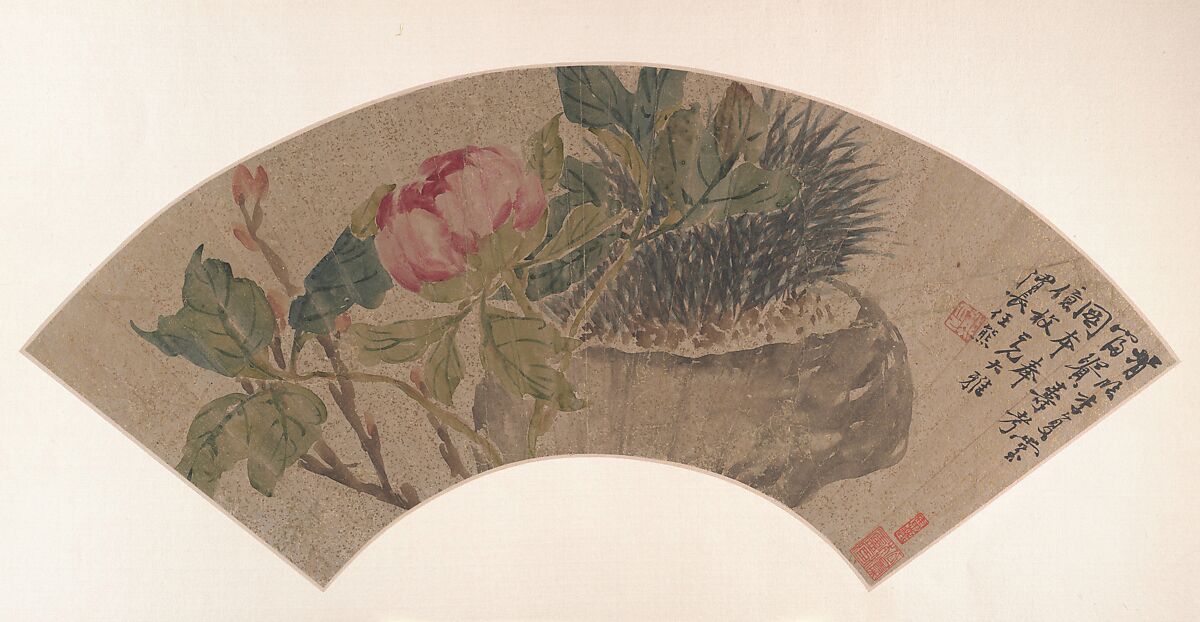Ren's richly decorative fan is an interpretation of the 18th century "boneless" (ink without outline) style. Ren renders presence through the lush fullness of ink without painting an organically coherent plant; you will look in vain for a stem to support the heavy bud; it has a less cerebral appeal and evokes a real world of rooted plants, rough stone pots and contrasting textures.