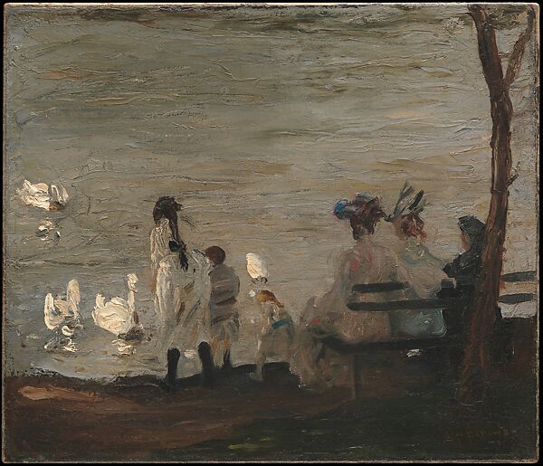 Having given up his studies at Ohio State University after three years, Bellows arrived in New York in 1904. Under the influence of his teacher, Robert Henri, he devoted himself to recording vignettes of city life. In this, one of his earliest New York scenes, Bellows depicted children feeding the tame swans that inhabited the ponds of Central Park. Thickly applied paint energizes the painting’s surface and anticipates the dashing brushwork that Bellows enlisted for his later views of grittier neighborhoods and their denizens.