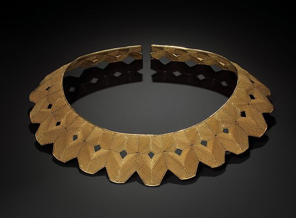 Hu uses traditional textile techniques of weaving, twining, wrapping, and braiding to transform gold and silver wire into extraordinary body adornment. Her fingers are her tools, and the inspiration for her patterns comes from the classical Greek, Etruscan, and Celtic styles. To enhance these associations, high-karat gold, with its deep yellow color, is her metal of choice. Choker #70 was made to celebrate the soprano Elizabeth Rethberg's (1894–1976) feature role in Verdi's opera Aida, set in ancient Egypt.