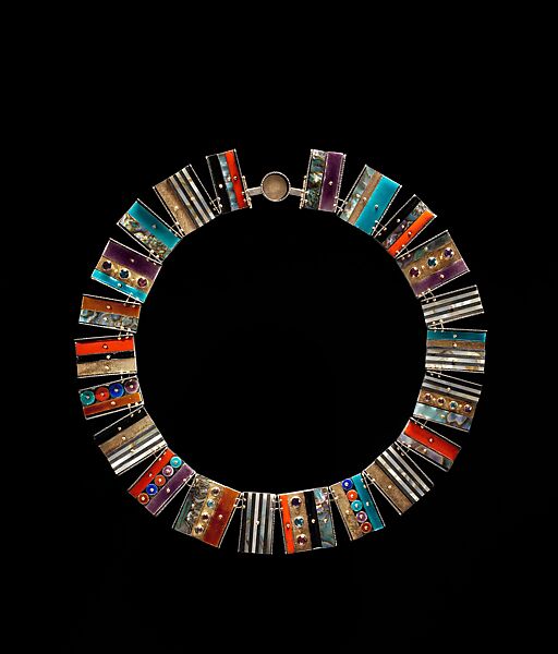 Earl Pardon, who trained as a painter, taught courses in jewelry, enameling, painting, and sculpture throughout his long career at Skidmore College from 1951 to 1988. This mosaic panel necklace, one of his later works, demonstrates his passion for both painting and jewelry. Through an intricate arrangement of richly enameled and embellished hinged panels, he created a highly wearable necklace.