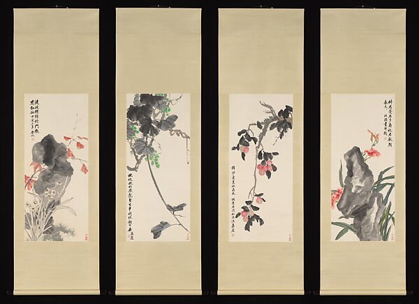 In this set of auspicious flowers and fruits which might hang together in a prominent place, such as a reception hall, or alternate according to the season, Jin Cheng achieves with expressive ink and flashes of bright color the tastefully decorative effects sought after by patrons of the period.
