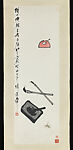 This painting of artists' tools—inkstone, water pot and brushes with ink trailing from the brush tip—conveys the fresh vision of Qi Baishi brought to painting by sweeping away pedantry, stale imitation and tired imagery. Sophisticated, sure and sincere, his paginating wittily conjures what is not depicted—painter and work—and the deliberate simplicity of his brushwork in the tools is complemented by the meticulous polish of the insect that feels its way across the imagined painter's table.