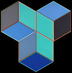 Untitled, a bold geometric painting of three cubes rendered on three separate canvases, tricks the eye. Here Loving puts the deceptive effects of color to excellent use, juxtaposing shades of blue, green, red, and yellow in ways that unsettle the cubes and keep their positions in space fluid. Untitled behaves dynamically as a result, with its painted shapes appearing to flip and fold, twist and tumble.