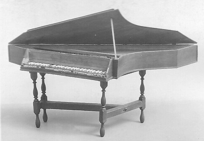 Technical description: Case with mitered tail, of walnut walls and front of name board veneered with satinwood, with dark stringing; walnut lid appears altered, may not be original; stand with four turned legs and stretchers; GG-g3, ebony naturals with ivory arcades, skunktail accidentals of an ebony fillet surrounded by ivory sides, key frame was originally two-rail frame with overhead dip rail, keys guided by vertical pins that fit into slots in the rear of key levers; jacks of pear on fruitwood, bristle springs, quill plectra; box register built of shaped blocks; jacks and key levers have small lead weights that may be original; no rose in soundboard. (Douglas Maple 1983)